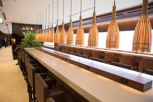 竹ひごをモチーフにした照明を配した福岡空港サクララウンジのカウンターテーブル=17年3月28日 PHOTO: Tatsuyuki TAYAMA/Aviation Wire