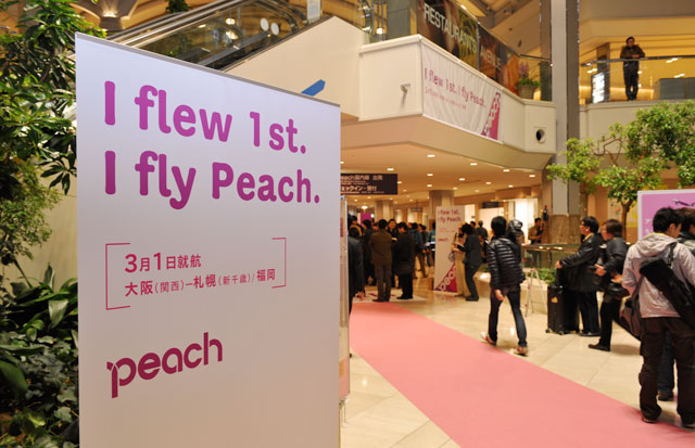 チェックイン機などが設置され暫定的なピーチ用ターミナルとなった関西空港のエアロプラザ=12年3月1日 PHOTO: Tadayuki YOSHIKAWA/Aviation Wire
