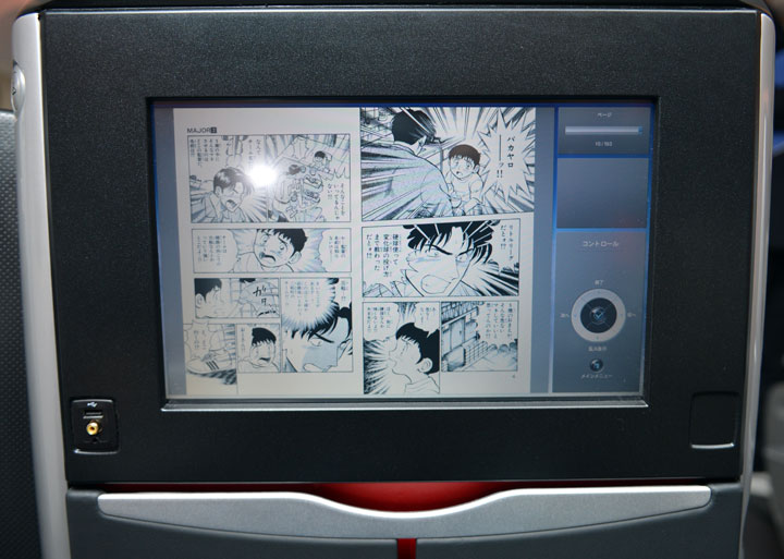 JALの787のビジネスクラスシートに映し出されたスカイマンガ=12年3月 PHOTO: Tadayuki YOSHIKAWA/Aviation Wire