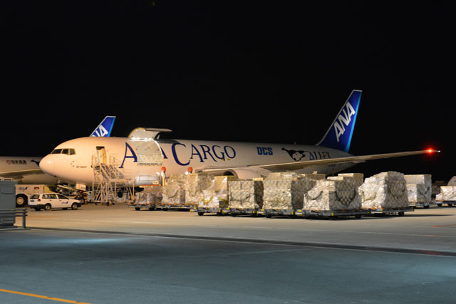 沖縄貨物ハブで荷物を降ろすANAの767-300BCF=12年10月 PHOTO: Tadayuki YOSHIKAWA/Aviation Wire
