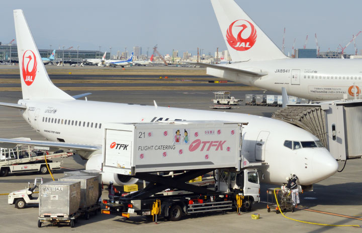 ひなまつりフライト用にひな人形などのイラストを飾り付けたTFKの機内食運搬車。隣には昨年同フライトに使用されたハロースマイルジェットも=3月3日 PHOTO: Tadayuki YOSHIKAWA/Aviation Wire