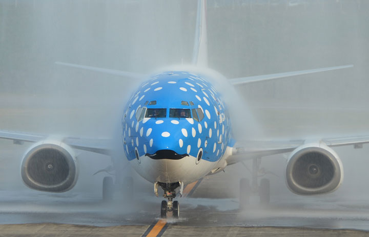 放水アーチをくぐり抜けるJTAのジンベエジェット=3月7日 PHOTO: Tadayuki YOSHIKAWA/Aviation Wire