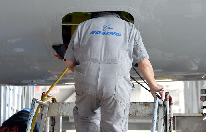 787の前方電気室から出るボーイングの作業員=4月28日 PHOTO: Tadayuki YOSHIKAWA/Aviation Wire