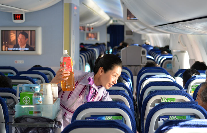 乗客に飲み物をサービスするANAの客室乗務員=5月26日 PHOTO: Tadayuki YOSHIKAWA/Aviation Wire