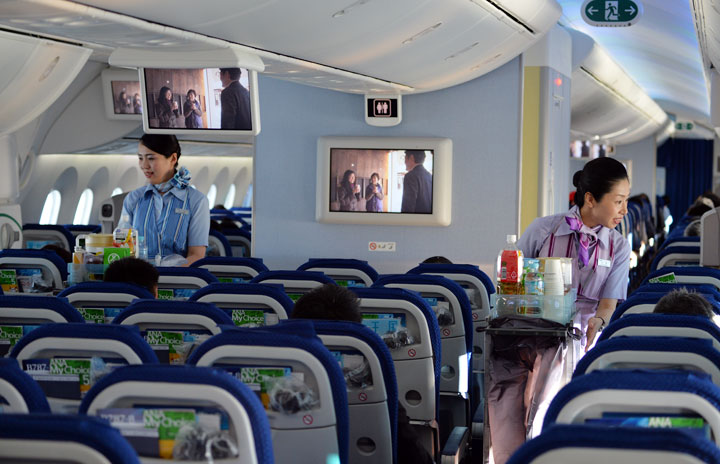 乗客に飲み物をサービスするANAの客室乗務員=5月26日 PHOTO: Tadayuki YOSHIKAWA/Aviation Wire