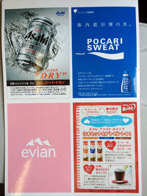 広告が入ったピーチのメニュー=5月20日 PHOTO: Tadayuki YOSHIKAWA/Aviation Wire