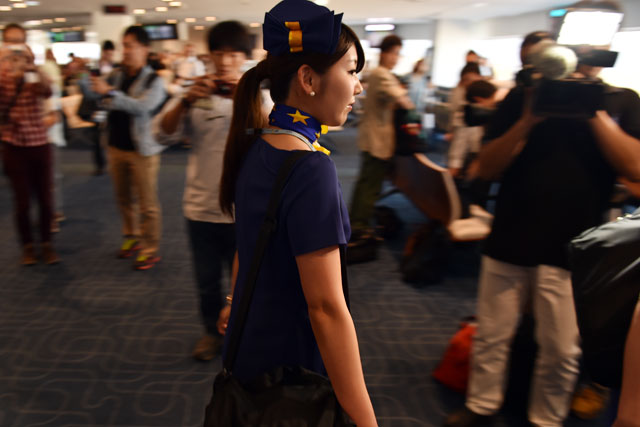 搭乗口へ向かうスカイマークの客室乗務員=6月14日 PHOTO: Tadayuki YOSHIKAWA/Aviation Wire