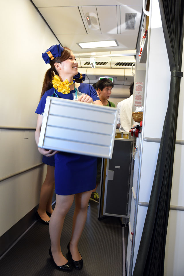 ギャレー上部の物入れを取り出す客室乗務員=6月14日 PHOTO: Tadayuki YOSHIKAWA/Aviation Wire