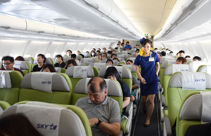 キャンペーン用制服を着用した客室乗務員=6月14日 PHOTO: Tadayuki YOSHIKAWA/Aviation Wire