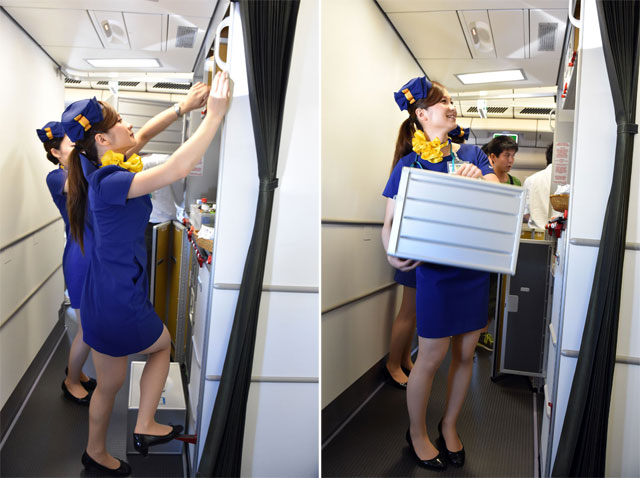 ギャレー上部の物入れを取り出す客室乗務員=6月14日 PHOTO: Tadayuki YOSHIKAWA/Aviation Wire