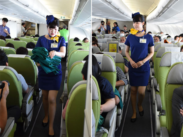 機内で毛布を配る客室乗務員(左)と巡回する客室乗務員=6月14日 PHOTO: Tadayuki YOSHIKAWA/Aviation Wire