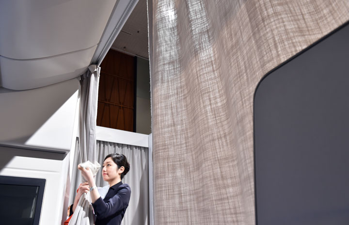 エールフランス航空の新ファーストクラス「ラ・プルミエール」に設けられたカーテン=2月27日 PHOTO: Tadayuki YOSHIKAWA/Aviation Wire
