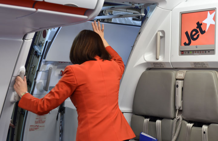 ドアが閉まり地上係員に手を振る客室乗務員=2月28日 PHOTO: Tadayuki YOSHIKAWA/Aviation Wire