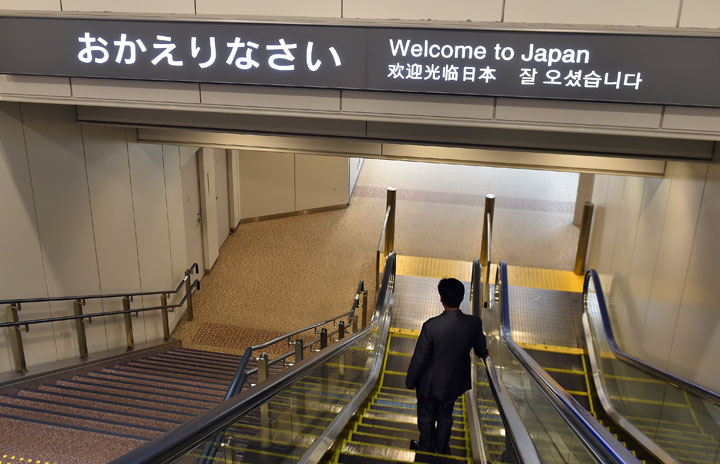海外からの到着客を出迎える成田空港の案内板=15年3月 PHOTO: Tadayuki YOSHIKAWA/Aviation Wire