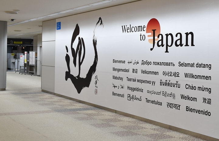 海外からの到着客を出迎える成田空港のパネル=15年3月 PHOTO: Tadayuki YOSHIKAWA/Aviation Wire