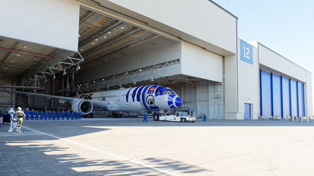 シアトルにあるボーイングのエバレット工場で開かれたロールアウト式典で姿を現すANAのR2-D2ジェット=9月12日 PHOTO: Tadayuki YOSHIKAWA/Aviation Wire