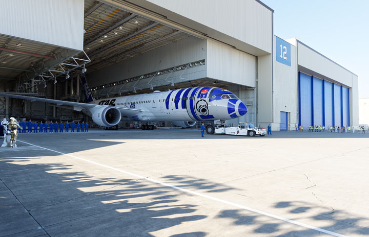 シアトルにあるボーイングのエバレット工場で開かれたロールアウト式典で姿を現すANAのR2-D2ジェット=9月12日 PHOTO: Tadayuki YOSHIKAWA/Aviation Wire