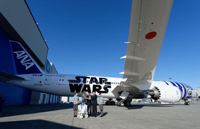 ロールアウトしたANAのR2-D2ジェットの前に並ぶR2-D2とC-3PO、客室乗務員ら=9月12日 PHOTO: Tadayuki YOSHIKAWA/Aviation Wire