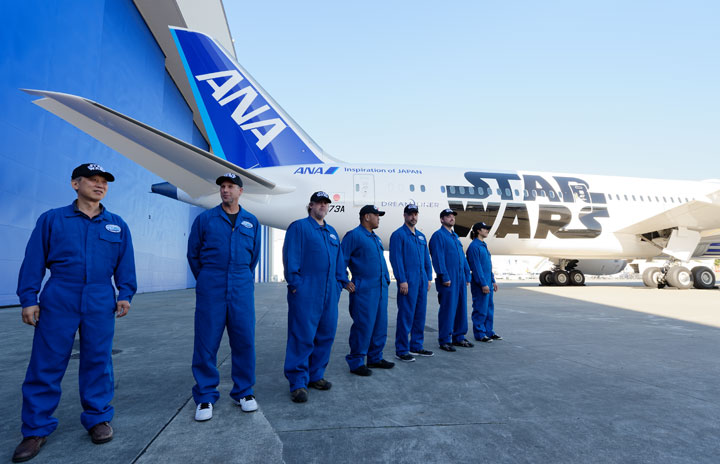 ロールアウトしたANAのR2-D2ジェットの前に並ぶボーイングの塗装スタッフ=9月12日 PHOTO: Tadayuki YOSHIKAWA/Aviation Wire