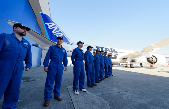 ロールアウトしたANAのR2-D2ジェットの前に並ぶボーイングの塗装スタッフ=9月12日 PHOTO: Tadayuki YOSHIKAWA/Aviation Wire