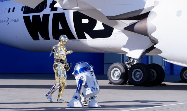ロールアウトしたANAのR2-D2ジェットに駆け寄るR2-D2とC-3PO=9月12日 PHOTO: Tadayuki YOSHIKAWA/Aviation Wire