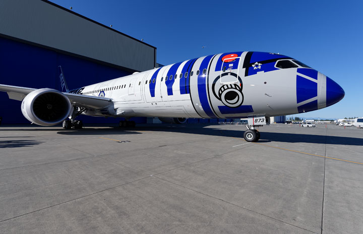 シアトルにあるボーイングのエバレット工場で開かれたロールアウト式典で姿を現したANAのR2-D2ジェット=9月12日 PHOTO: Tadayuki YOSHIKAWA/Aviation Wire