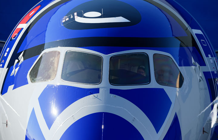 シアトルにあるボーイングのエバレット工場で開かれたロールアウト式典で姿を現したANAのR2-D2ジェット=9月12日 PHOTO: Tadayuki YOSHIKAWA/Aviation Wire