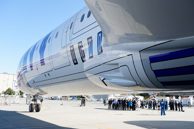 シアトルにあるボーイングのエバレット工場で開かれたロールアウト式典で姿を現したANAのR2-D2ジェット=9月12日 PHOTO: Tadayuki YOSHIKAWA/Aviation Wire