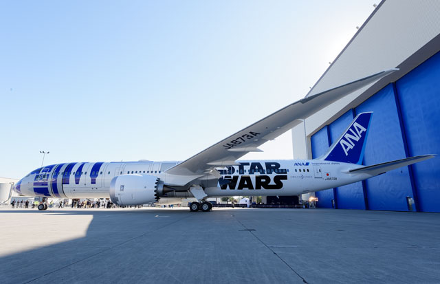 シアトルにあるボーイングのエバレット工場で開かれたロールアウト式典で姿を現したANAのR2-D2ジェット=9月12日 PHOTO: Tadayuki YOSHIKAWA/Aviation Wire