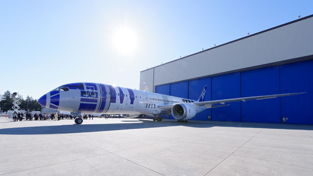 シアトルにあるボーイングのエバレット工場で開かれたロールアウト式典で姿を現したANAのR2-D2ジェット=9月12日 PHOTO: Tadayuki YOSHIKAWA/Aviation Wire