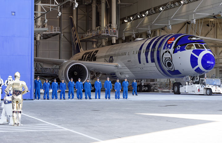 シアトルにあるボーイングのエバレット工場で開かれたロールアウト式典で姿を現すANAのR2-D2ジェットと整列するボーイングの塗装スタッフ=9月12日 PHOTO: Tadayuki YOSHIKAWA/Aviation Wire