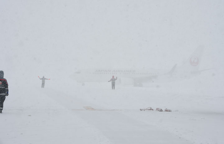 吹雪く中青森空港に到着するJALの737-800=16年1月21日 PHOTO: Tadayuki YOSHIKAWA/Aviation Wire