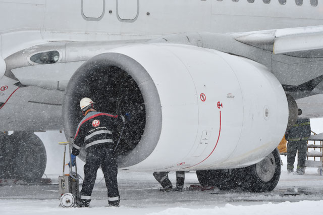 エンジンカウル内の雪を落とすJALの整備士=16年1月21日 PHOTO: Tadayuki YOSHIKAWA/Aviation Wire