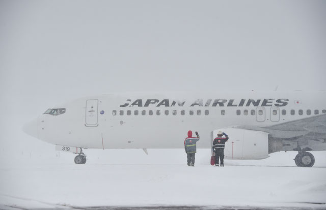 整備士とグラハンスタッフに見送られて出発するJALの737-800=16年1月21日 PHOTO: Tadayuki YOSHIKAWA/Aviation Wire
