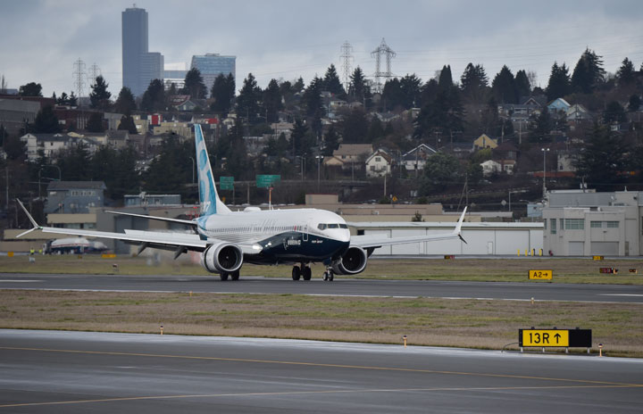 初飛行を終えボーイング・フィールドに着陸する737 MAX 8の飛行試験初号機=16年1月29日 PHOTO: Tadayuki YOSHIKAWA/Aviation Wire