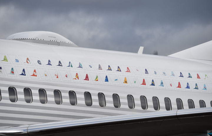 導入各社のロゴが描かれた737 MAX 8の飛行試験初号機=16年1月29日 PHOTO: Tadayuki YOSHIKAWA/Aviation Wire