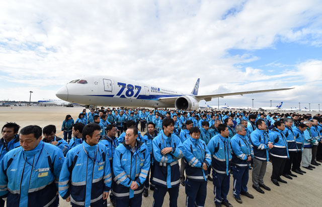 成田空港で国際線就航30周年の人文字を作るANA社員ら=16年2月8日 PHOTO: Tadayuki YOSHIKAWA/Aviation Wire