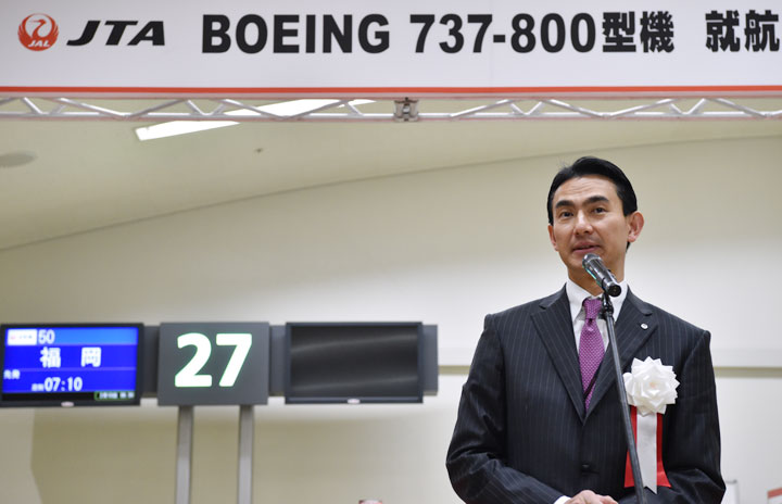 737-800の就航式典であいさつするJTAの丸川社長=16年2月10日 PHOTO: Tadayuki YOSHIKAWA/Aviation Wire
