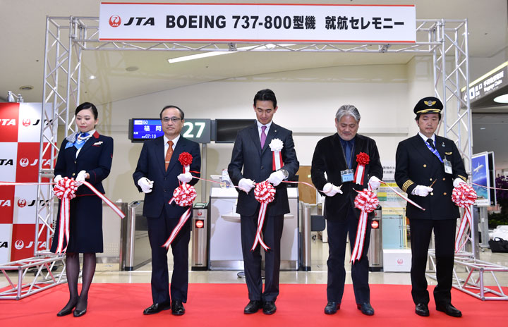 737-800の就航式典でテープカットするJTAの丸川社長(中央)ら=16年2月10日 PHOTO: Tadayuki YOSHIKAWA/Aviation Wire