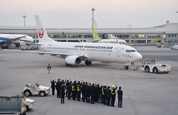 JTAの社員に見送られて那覇空港を出発する737-800公式初便の福岡行きNU050便=16年2月10日 PHOTO: Tadayuki YOSHIKAWA/Aviation Wire