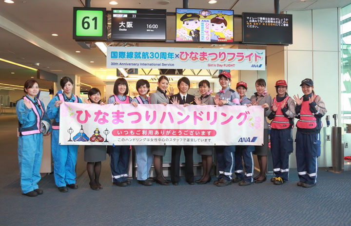 ひなまつりフライトを担当したANAのスタッフ=16年3月3日 PHOTO: Youichi KOKUBO/Aviation Wire