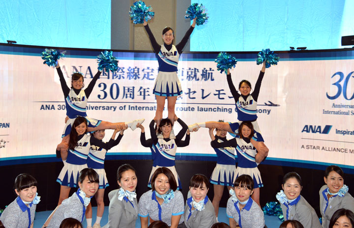 成田空港で開かれた国際線就航30周年記念式典でダンスパフォーマンスを披露するANA社員=16年3月3日 PHOTO: Yoshikazu TSUNO/Aviation Wire