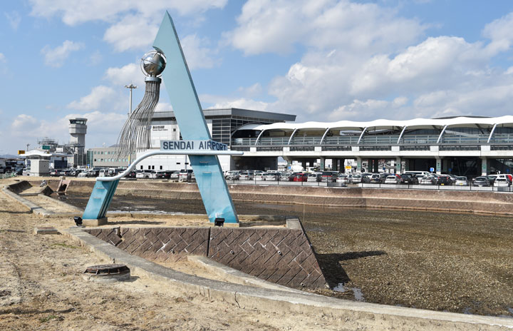 仙台空港入口のオブジェは津波の被害を受けたまま=16年3月11日 PHOTO: Tadayuki YOSHIKAWA/Aviation Wire