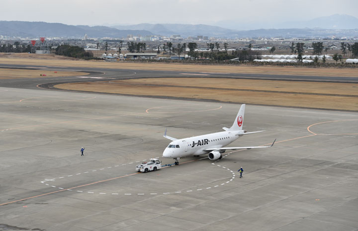 黙祷後最初に仙台空港を出発するジェイエアの伊丹行きJL2208便=16年3月11日 PHOTO: Tadayuki YOSHIKAWA/Aviation Wire