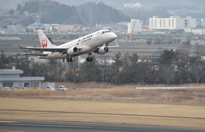 仙台空港を離陸するジェイエアの伊丹行きJL2208便=16年3月11日 PHOTO: Tadayuki YOSHIKAWA/Aviation Wire