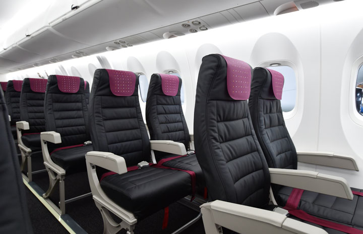 シートカラーがJALスカイネクストに準じたRACが導入するQ400CCの機内=16年3月30日 PHOTO: Tadayuki YOSHIKAWA/Aviation Wire