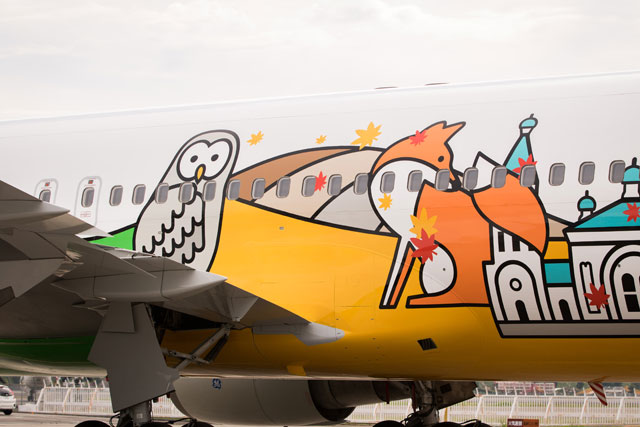 胴体に新緑あふれる春から初夏、夏の草原、収穫と紅葉の中で動物たちが冬支度を始める秋、一面が白銀の世界に変わる冬、道内の名所を描いたベア・ドゥ北海道JET=16年7月12日 PHOTO: Tatsuyuki TAYAMA/Aviation Wire