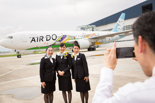 ベア・ドゥ北海道JETと記念撮影するエア・ドゥの客室乗務員=16年7月12日 PHOTO: Tatsuyuki TAYAMA/Aviation Wire