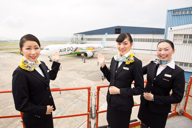 ベア・ドゥ北海道JETを紹介するエア・ドゥの客室乗務員=16年7月12日 PHOTO: Tatsuyuki TAYAMA/Aviation Wire