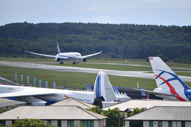 ファンボロー航空ショーで展示飛行を終えて着陸するANAの787-9=16年7月13日 PHOTO: Tadayuki YOSHIKAWA/Aviation Wire